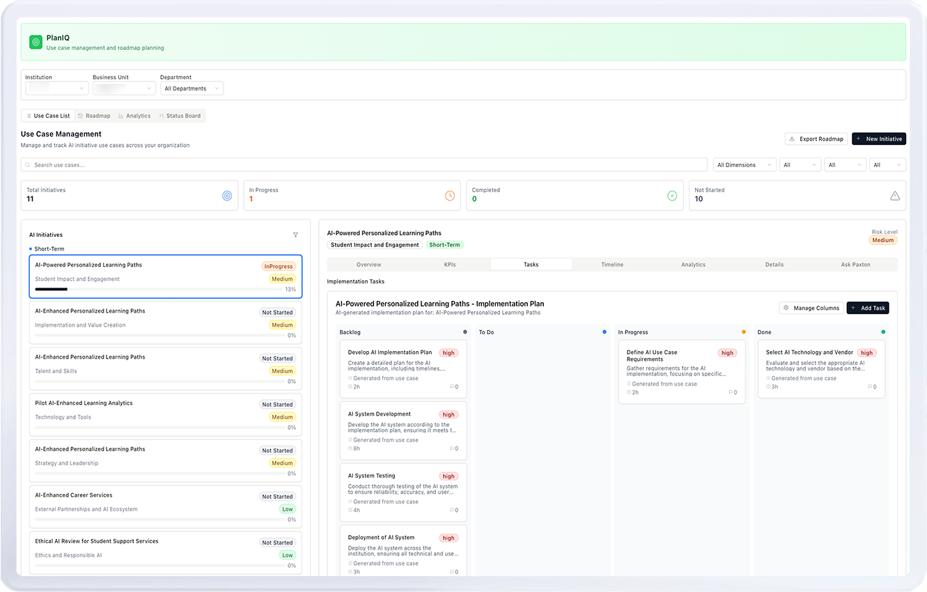 AI use cases tied to maturity gaps with timelines, risks, resources, and KPIs.